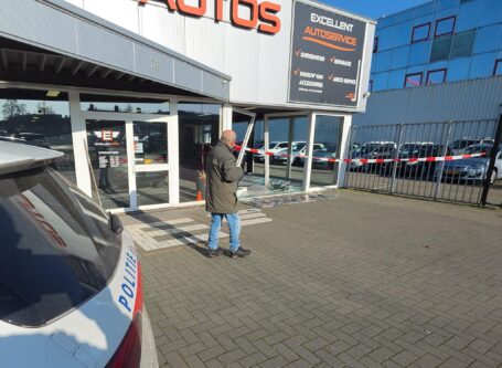 DORDRECHT – Een auto is zaterdagmiddag dwars door de pui van de showroom van Excellent Auto’s in Dordrecht gereden. Kort daarvoor was het voertuig in botsing gekomen met een lijnbus. De oorzaak van de aanrijding is nog onbekend. Het ongeval vond rond 12.00 uur plaats op de Merwedestraat. De schade aan de lijnbus bleef beperkt. Het ongeluk gebeurde op de rijbaan in de richting van de stad. ( Foto’s: Stolk Fotografie )