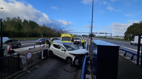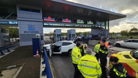 DORDRECHT – Bij de Dordtse Kil is vrijdagochtend een auto tegen de vangrail geknald bij de tol vanaf de Kiltunnel. Er is niemand gewond geraakt. (Foto’s en Video: Stolk Fotografie)