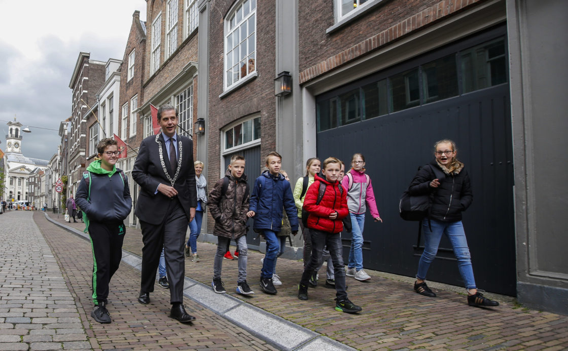 DORDRECHT – Burgemeester Wouter Kolff speelde vanmorgen stadsgids voor leerlingen van groep 6 van de Oranje Nassauschool uit Sliedrecht. Dit extra bijzondere uitstapje van de leerlingen naar Dordrecht was namelijk de viering van tien jaar educatieve ontdekkingstochten. (Foto: Thymen Stolk)
