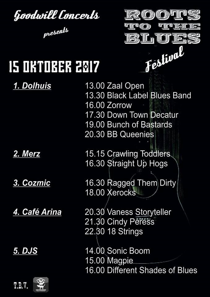 Die locaties zijn, naast het Dolhuis, Jazzpodium DJS en de cafés Merz, Cozmic en Arina. “Wij zijn blij met die uitbreiding, maar het hoeft nu niet veel groter te worden. Met Big Rivers hebben we al een prachtig groot festival in Dordrecht”, zegt Joop Vastenhoud, één van de initiatiefnemers. Blij is hij ook met de vijftien bands die belangeloos meewerken aan het festival. Zoals de naam doet vermoeden zijn het niet allemaal pure bluesbands, maar ook Americana- en rootsbands. Goodwill Concerts organiseerde ook al diverse concerten voor de Voedselbank, maar ook de Louterbloemen kan rekenen op blijvende steun, zegt Vastenhoud. “Die beesten kunnen er ook niks aan doen dat ze daar zijn beland. En wij hebben veel respect voor al het goede werk dat de medewerkers doen.”