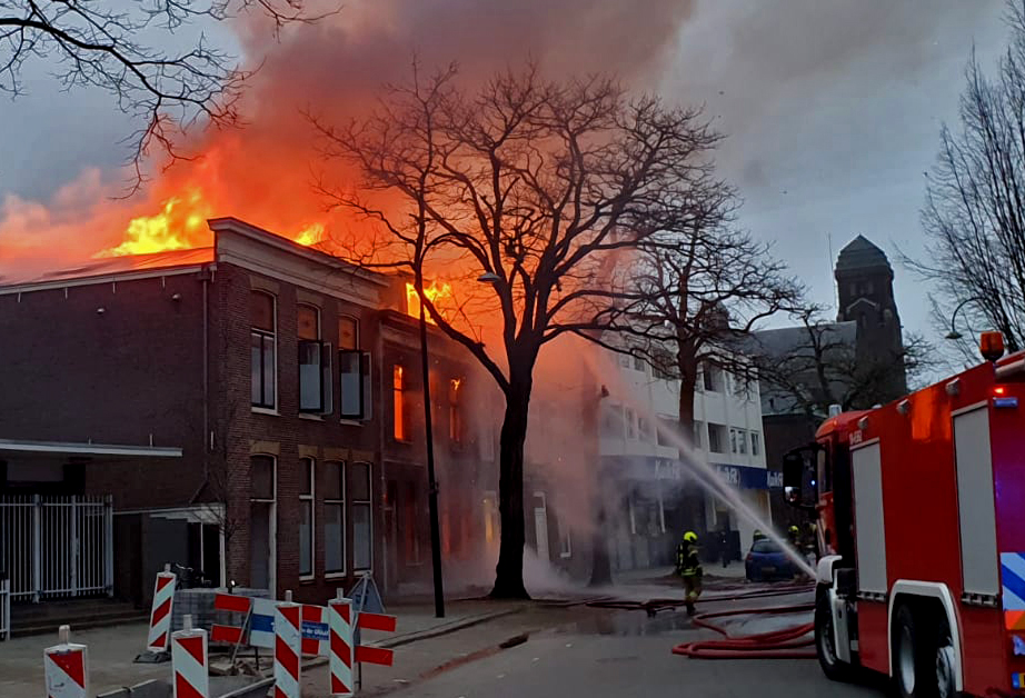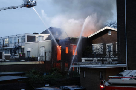 Het drinkwaterleidingbedrijf is aanwezig om een tijdens de brand gesprongen waterleiding te repareren. De brandweer is bezig met nabluswerkzaamheden.