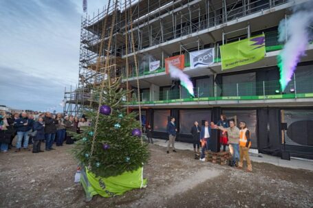 DORDRECHT – Onder toeziend oog van de toekomstige bewoners en wethouder Maarten Burggraaf werd dinsdagmiddag gevierd dat het hoogste punt van de bouw van woongebouw Het Wantij in de nieuwe wijk Stadswerven was bereikt. J.P. van Eesteren begon in januari van dit jaar met de bouwwerkzaamheden. De oplevering stond gepland voor het derde kwartaal van 2026. (Foto: Bert Rietberg)