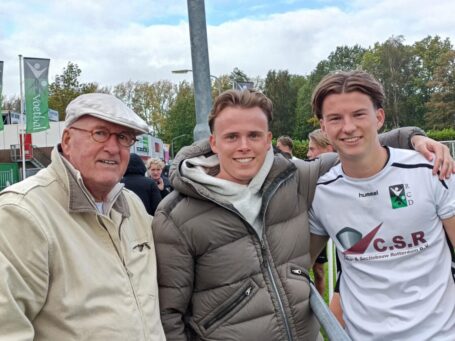 Zaterdag knalde kleinzoon Renzo Hoogmoed (21) in het shirt van DFC de bal vanaf elf meter weer eens tegen de touwen. En zondag scoorde de andere kleinzoon, Brett Twigt, RCD’s eerste goal (1-3). En dat allemaal voor de ogen van hun terecht trotse opa Dick, die in het betaald voetbal onder meer heel wat treffers fabriceerde in de shirts van onder meer Fortuna Sittard en FC Dordrecht. “Je zou bijna denken dat het in de genen zit”, aldus opa Dick.