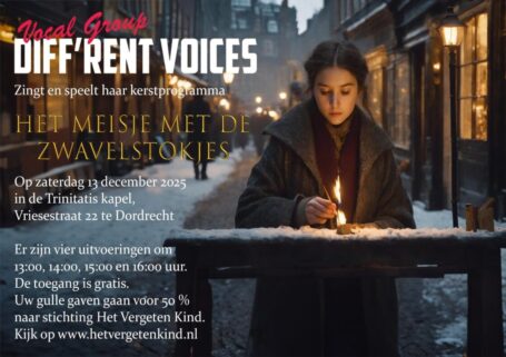 DORDRECHT – Op zaterdagmiddag 13 december 2025 brengt de Dordtse vocal group Diff’rent Voices maar liefst vier keer haar sfeervolle kerstproductie “Het meisje met de Zwavelstokjes” in de Trinitatiskapel. Vorig jaar trok de voorstelling veel publiek en waren de reacties volgens het koor “laaiend enthousiast”.