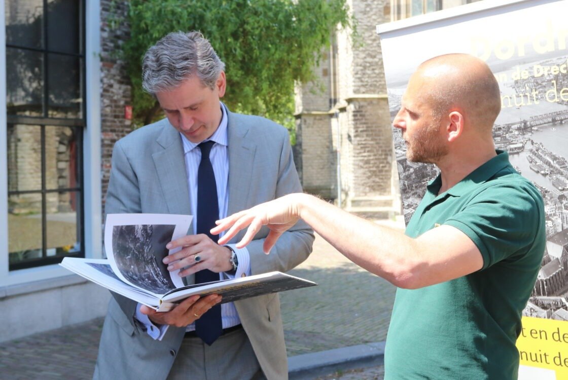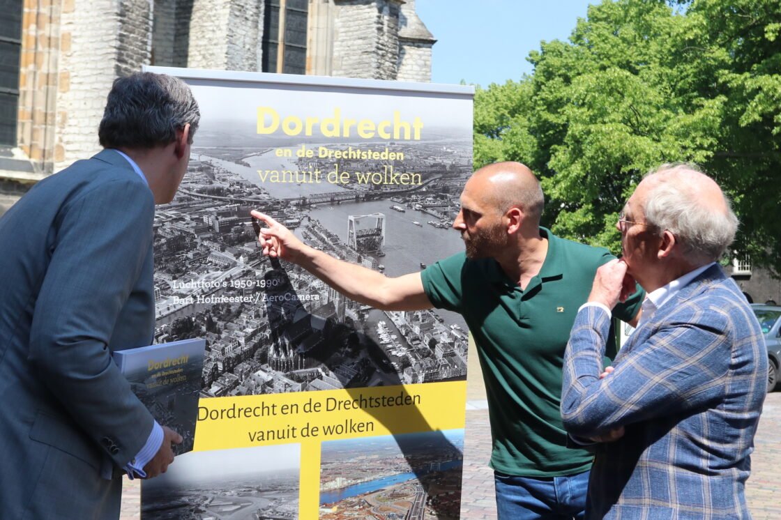 DORDRECHT – Burgemeester Wouter Kolff ontving maandag het eerste exemplaar van het boek ‘Dordrecht en de Drechtsteden vanuit de wolken’, met luchtfoto’s door Bart Hofmeester uit de periode 1950-1990 uit handen van de Dordtse auteur Niels Dekker en uitgever Peter Egge. (Foto’s: Thymen Stolk)