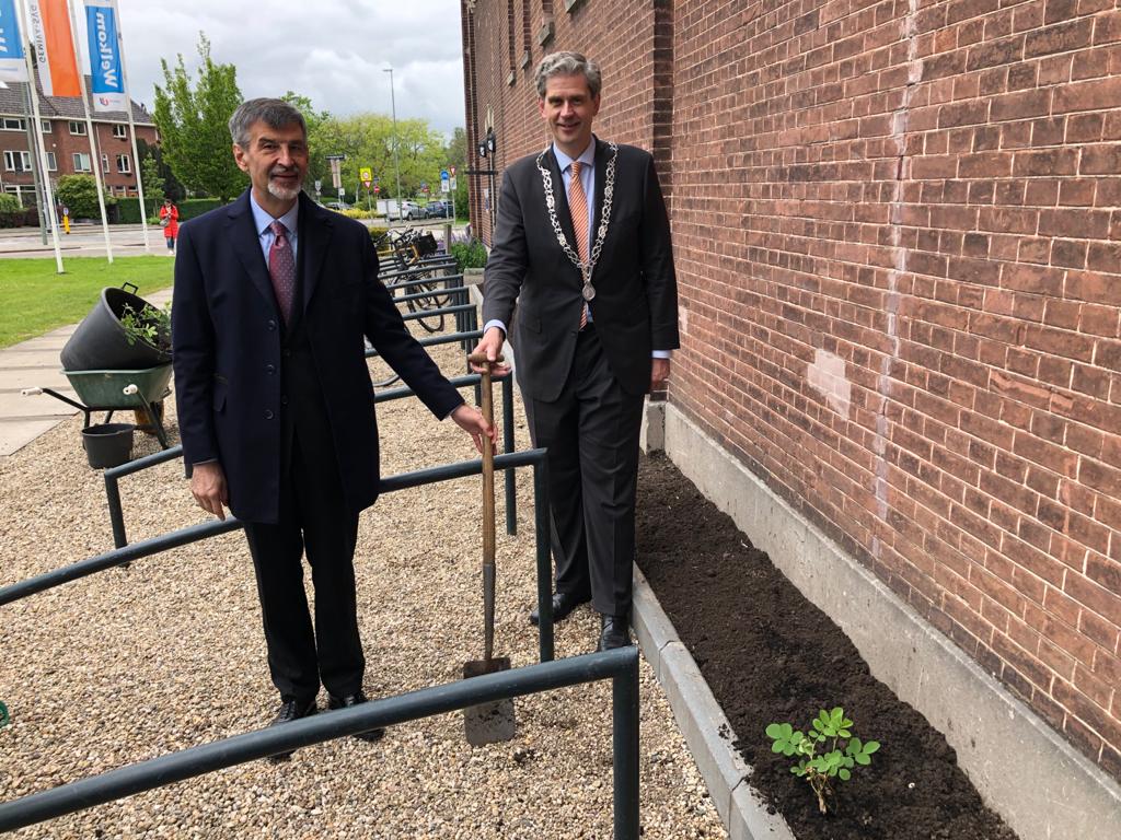 DORDRECHT – De Bulgaarse ambassadeur Konstantin Dimitrov en de Dordtse burgemeester Wouter Kolff plantten donderdag samen Bulgaarse rozenstruiken op het terrein van Duurzaamheidscentrum Weizigt aan het van Baerleplantsoen. Dit deden zij om het twintigjarig jubileum van de stedenband te vieren.