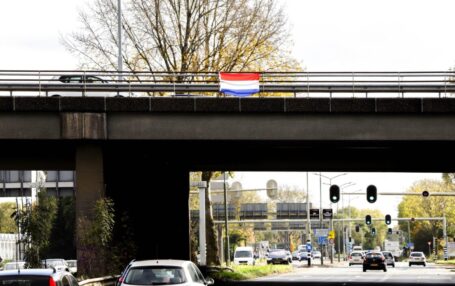 De vlag is donderdag en vrijdag zichtbaar boven de Provincialeweg, waar die is opgehangen bij het fietspad bij de N3. Ook op de A16 zwaait de Nederlandse vlag.