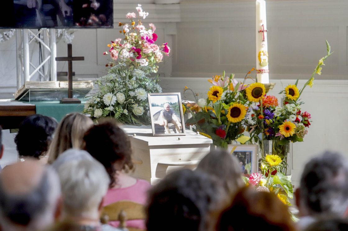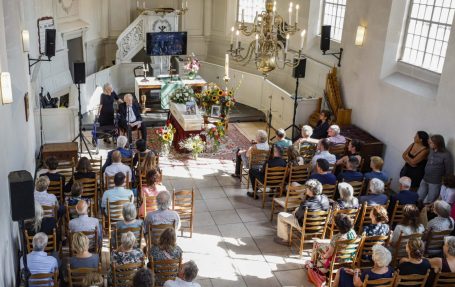 DORDRECHT – Maandagmiddag werd tijdens een bijeenkomst in de Trinitatiskapel in de Vriesestraat door familie, vrienden en bekenden afscheid genomen van schrijver en journalist Frits Baarda, die vorige week onverwacht op 67-jarige leeftijd overleed. Het werd een drukbezochte bijeenkomst met meerdere sprekers. De kerk zat vol, er was een liveverbinding en buiten de kerk keken mensen via een scherm mee, wat veel zegt over de indruk die Baarda tijdens zijn leven heeft nagelaten. Uit de toespraken kwam het beeld naar voren van een mooi, bevlogen en getalenteerd mens, dat door velen gemist zal worden. Na de bijeenkomst werd Baarda naar de Essenhof gebracht, waar in besloten kring afscheid van hem werd genomen. (Foto’s: Stolk Fotografie)