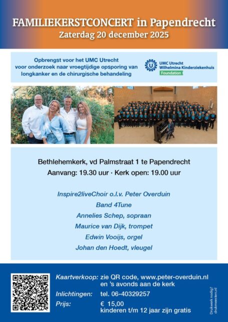 PAPENDRECHT – In de Bethlehemkerk aan de Van der Palmstraat 1 te Papendrecht wordt zaterdagavond 20 december 2025 een groot Kerstconcert gegeven. De opbrengst is voor onderzoek naar vroegtijdige opsporing longkanker.