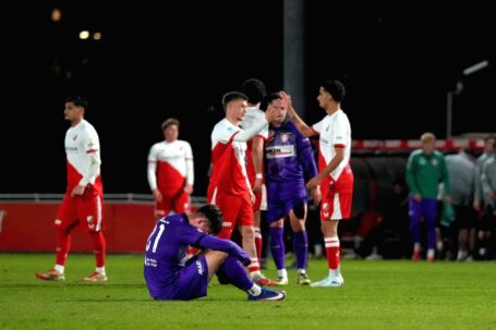 UTRECHT – FC Dordrecht heeft afgelopen vrijdag met zijn uitduel bij Jong FC Utrecht met 3-1 verloren. De ploeg van Dirk Kuyt had voor rust geen antwoord op de hoge druk van de thuisploeg en keek door treffers van Tijn den Boggende en Rafik El Arguioui al snel tegen een 2-0 achterstand aan. ( Foto: VK Sportphoto/Nick Koole)