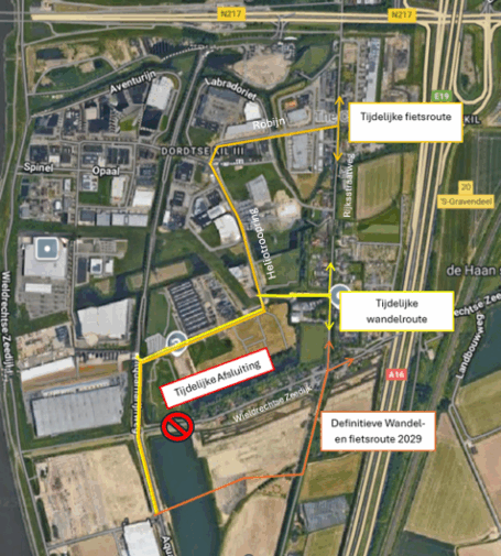 Op het deel van de Rijksstraatweg bij de Wieldrechtse Zeedijk rijden veel grondtransporten. Het is niet veilig als ook voetgangers en fietsers gebruik maken van de weg. Daarom is dit gedeelte van de Rijksstraatweg vanaf medio oktober afgesloten voor al het verkeer.