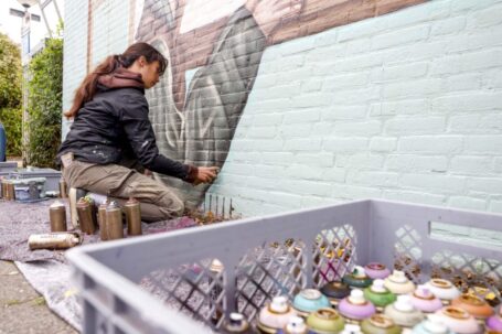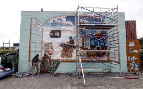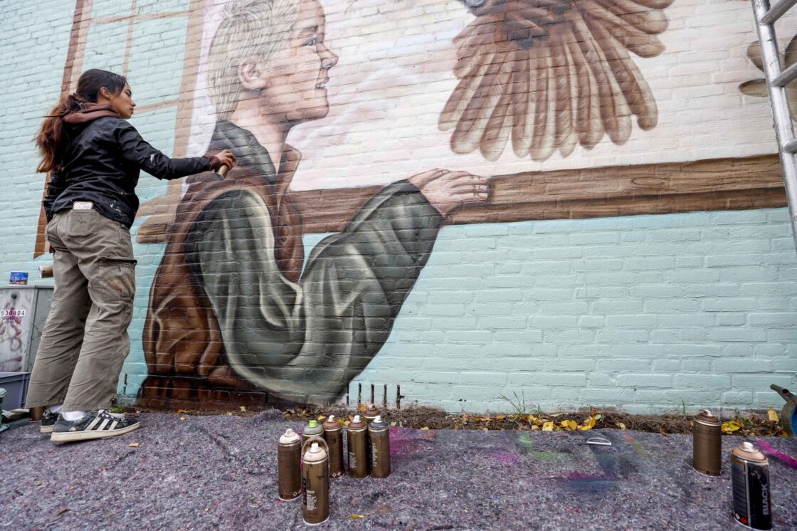 DORDRECHT – Het kunstwerk van straatkunstenaar Anouk Brand aan de Pijnenburg 8 in Sterrenburg is inmiddels zo goed als afgerond. Dankzij de 20-jarige en de betrokkenheid van buurtbewoners krijgt Sterrenburg er een opvallend stukje straatkunst bij. Vrijdag 10 oktober wordt het eindresultaat getoond. (Foto’s: Stolk Fotografie)