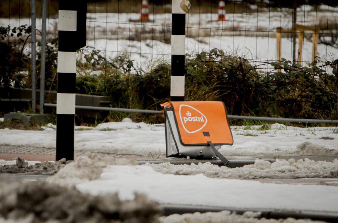 DORDRECHT -In de sneeuw ligt een tas van postbedrijf PostNL er verloren bij. In de Maasstraat in Dordrecht is een postbezorger zijn tas verloren. Een opvallende verschijning, zo’n grote oranje tas in de witte sneeuw. De tas was gelukkig leeg, dus er is als het goed is geen post verloren gegaan. (Foto: Stolk Fotografie)