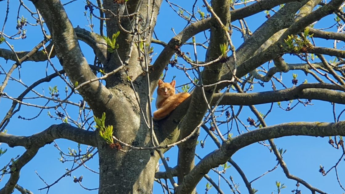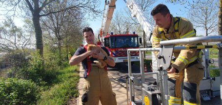 DORDRECHT – Weer een kat gered uit de boom in Dordrecht. Verkeersregelaars op de Hastingsweg zagen vandaag het diertje zitten en namen contact op met de brandweer. De kat kwam veilig beneden. (Foto’s en video: Thymen Stolk)