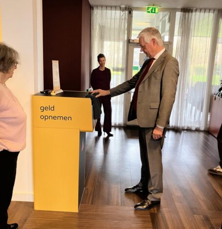DORDRECHT – Bewoners van De Staart kunnen voorlopig weer geld pinnen in hun eigen wijk. Sinds begin februari hangt er in de hal van Woon- en Zorgcentrum De Merwelanden een kleine geldautomaat die alleen biljetten van 20 euro uitgeeft. Op 12 februari pinde wethouder Wim van der Kruijff voor het eerst geld uit de automaat.