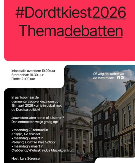 Veel Dordtenaren ervaren de gemeentepolitiek nog als een ‘ver-van-mijn-bed-show’. Daar moet verandering in komen met drie debatavonden op achtereenvolgende maandagen. Tijdens iedere avond gaan vijf à zes lijsttrekkers met elkaar én met wijkbewoners in gesprek over thema’s als wonen en buurtontwikkeling, armoede en bestaanszekerheid en veiligheid en voorzieningen.