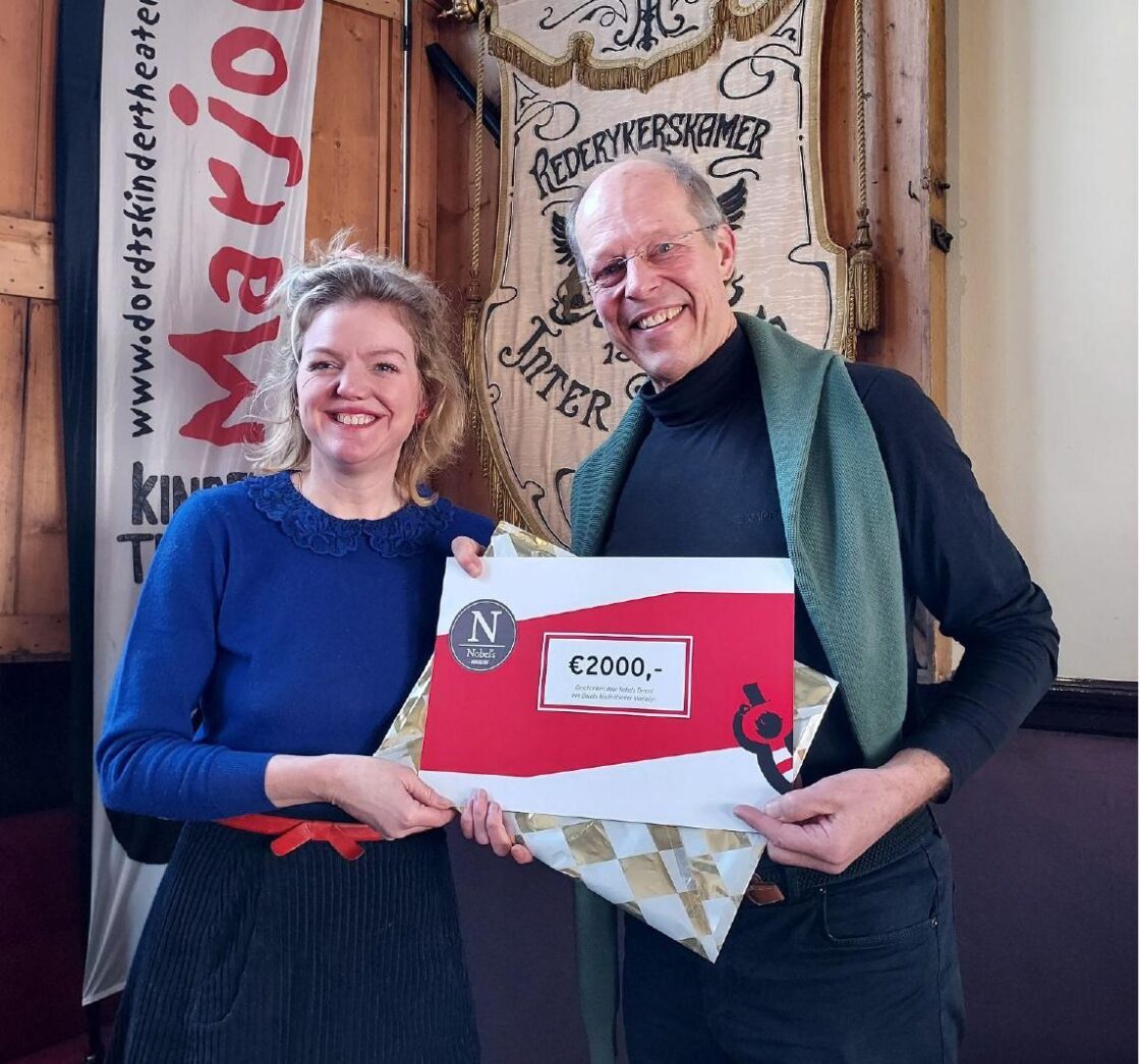 “Dordts Kindertheater Marjolijn is een mooi, intiem theater waar bijzonder mooi theater wordt geprogrammeerd. Het zijn mensen die iets moois maken voor kinderen – en dat doen wij bij Nobel’s ook. Dat past goed bij elkaar,” zegt Willemijn Nobel, eigenaresse van Nobel’s Brood. “Wij komen zelf graag naar de voorstellingen en de stichting ligt ons dan ook nauw aan het hart.” Andries Laane, voorzitter van Stichting Dordts Kindertheater Marjolijn, nam de cheque in ontvangst. “Wij zijn ontzettend dankbaar dat een instituut als Nobel’s Brood ons zo trouw blijft ondersteunen.”