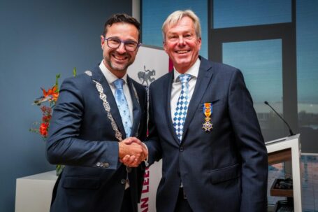 ZWIJNDRECHT – Vandaag is de heer P.L. (Peter) Rietberg (61) Koninklijk onderscheiden. Tijdens zijn officiële afscheid als voorzitter van de Raad van Bestuur van Koninklijke Van Leeuwen B.V. is de heer Rietberg benoemd tot Officier in de Orde van Oranje-Nassau. Burgemeester Leon Anink heeft hem de versierselen opgespeld die horen bij deze bijzondere Koninklijke onderscheiding. ( Foto: Gemeente Zwijndrecht )