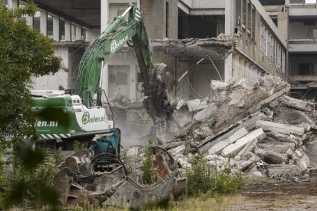 DORDRECHT – De aanwezigheid van vleermuizen zorgde er begin dit jaar voor dat de sloop van het oude Refaja-ziekenhuis én de naastgelegen zusterflat werd stilgelegd. De ABB Groep uit Sliedrecht gaat op het 6,5 hectare grote terrein een woonwijk met circa 225 woningen bouwen onder de naam Amstelwijck Park. Na het verplaatsen van de dieren is deze week de sloop hervat. (Foto: Thymen Stolk)