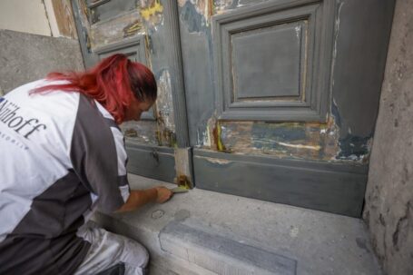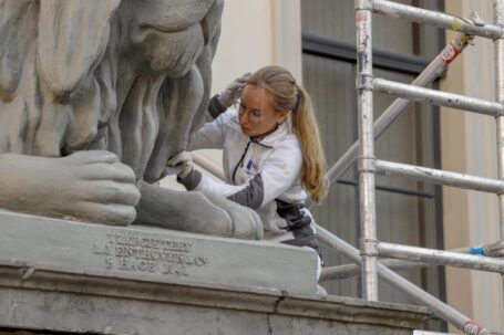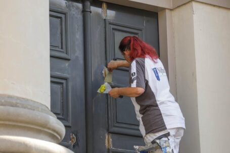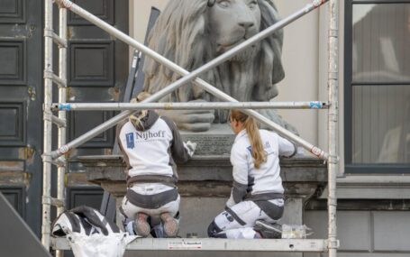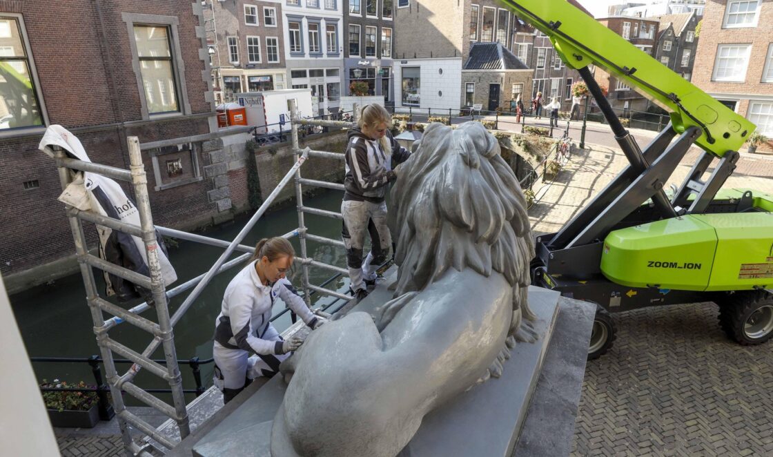 DORDRECHT – Het Stadhuis wordt de komende jaren flink gerenoveerd. Binnen worden onder meer de cv-ketels en radiatoren vervangen, zodat het gebouw weer comfortabel te gebruiken is. Buiten krijgen de deuren, de leeuwen en later ook alle gevels een onderhoudsbeurt. Het stuc- en pleisterwerk laat op verschillende plekken los en moet dus worden hersteld, waarna het wordt geschilderd. Dat laatste gaat ook met alle deuren en raamkozijnen gebeuren, net als de gouden letters boven de entree. Ook het natuursteen en voegwerk worden hersteld en versleten goten, leien en loodstroken indien nodig vervangen. In 2026 komt de voorgevel als laatste aan de beurt, waarbij natuursteen, voegwerk, goten en leien worden vernieuwd. Ondanks de werkzaamheden blijft het Stadhuis gewoon toegankelijk. Ook de vergaderingen van de gemeenteraad gaan hier onverminderd door.( Foto’s: Stolk Fotografie )