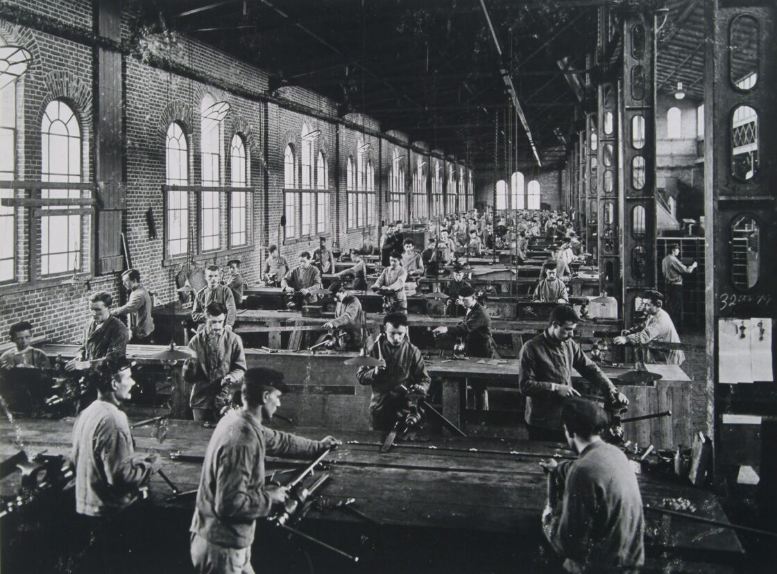 Hoofdfoto: Bankwerkers in de brandkastenfabriek van Lips in Dordrecht, 1897-1901.