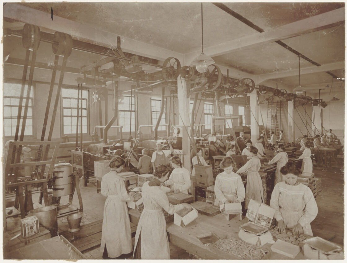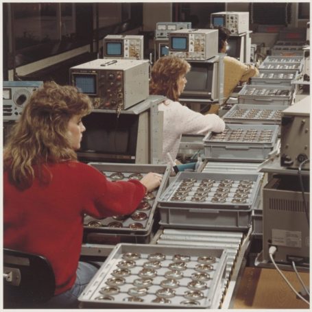 Onder: Montageafdeling voor motoren van de videorecorder, firma Johan de Witt Philips.Productiehal van de Victoria-fabriek in Dordrecht, voor koekjes en chocolade. 1915-1924.
