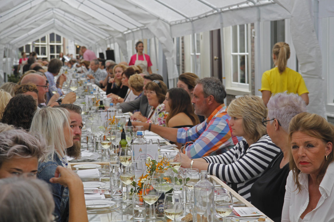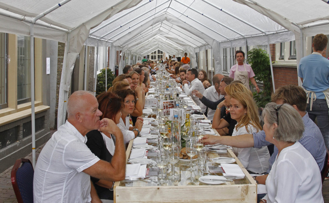 DORDRECHT – Ruim 180 deelnemers genoten zondag van een driegangen lunch van patron-cuisiner Erik van Loo van Parkheuvel (**Michelin) aan de langste tafel van lege jenever- en wijnflessen. Het evenement, dat plaats vond in de Vleeshouwersstraat, vestigde een wereldrecord. De opbrengst is bestemd voor Via Lumina en Stichting Voorleesexpress. ( Foto’s en filmpje : Thymen Stolk ) .