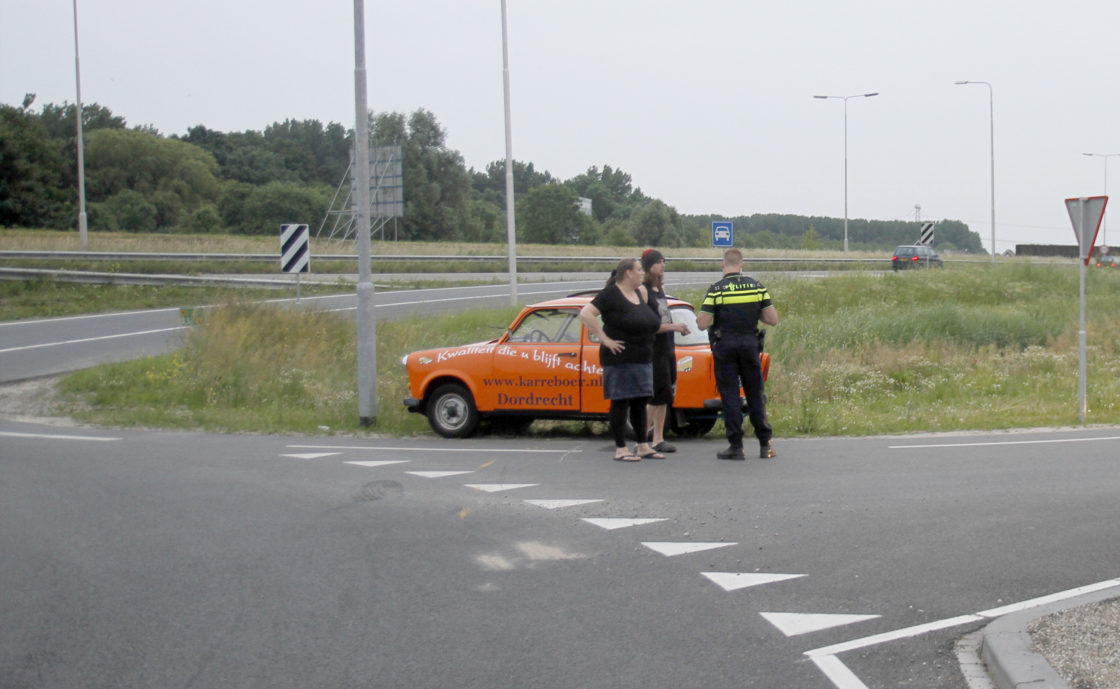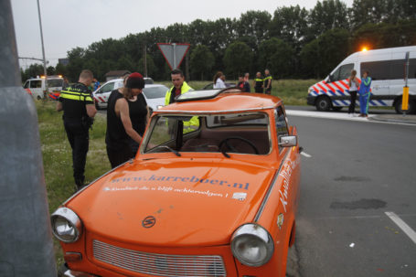 DORDRECHT – Vrijdagavond 10 juni is een trabant met drie personen erin over de geslagen net voor de oprit naar de Randweg n3 richting Breda . De inzittende van de trabant zijn met de schrik vrijgekomen. Door nog onbekende oorzaak raakte ze van de weg. ( Foto’s : Thymen Stolk ).