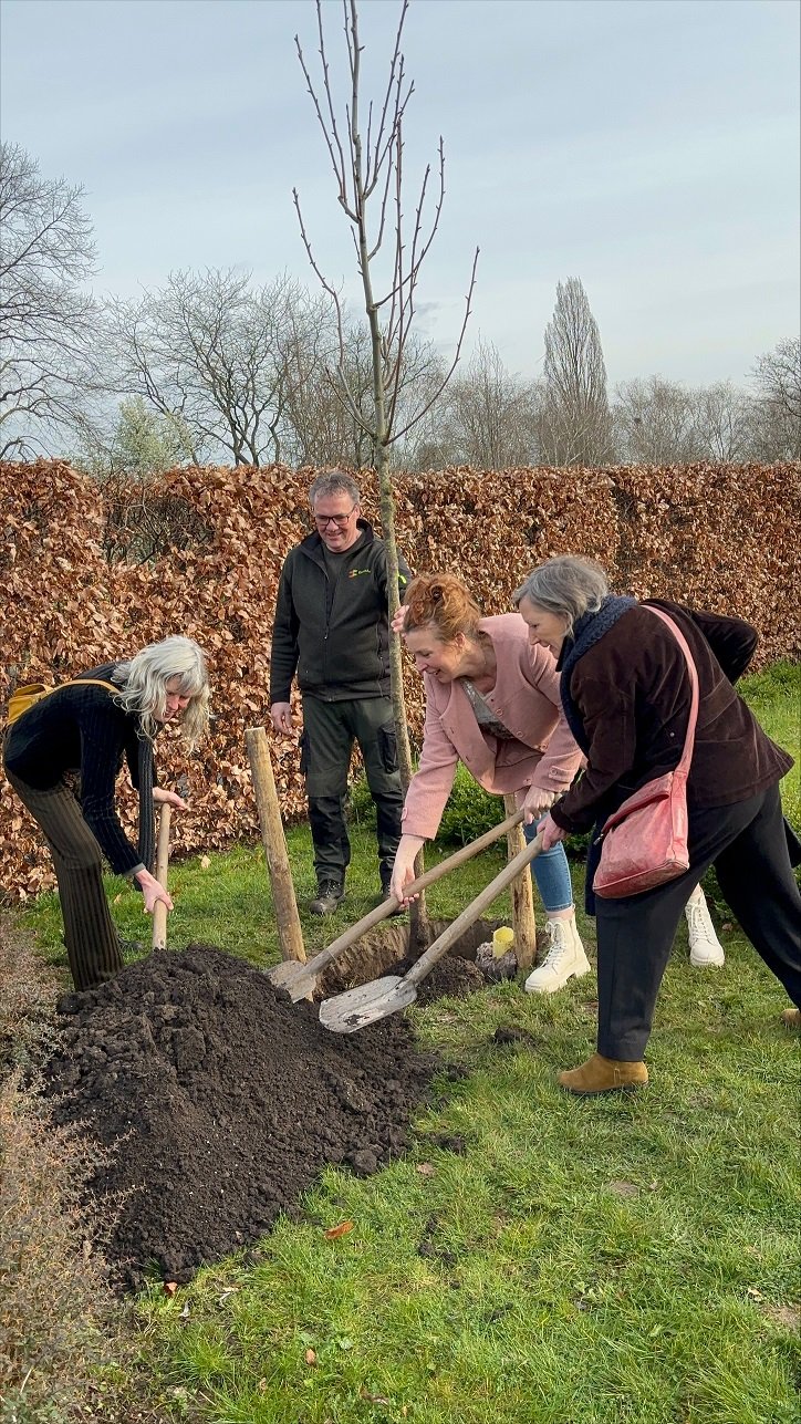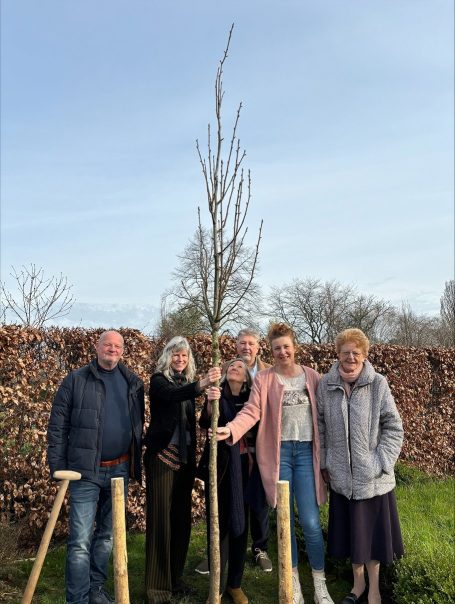 Marleen Oud, Geerten ten Bosch en Annemieke van Ooyen-Van Wijngaarden, in het midden, bij het planten van de Troostboom. Links Harry de Jong van D&O, achter maatschappelijk betrokken raadslid Marco Stam, rechts Annemiekes “lieve buurvrouw Els Immerzeel.”