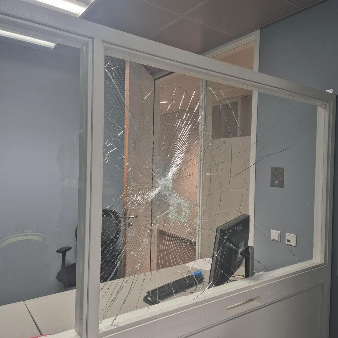 Dankzij een glazen scheidingswand tussen de verdachte en de agenten raakte niemand gewond, hoewel het glas brak en er rondvliegende splinters waren. Naast de oorspronkelijke verdenkingen zal de man zich nu ook moeten verantwoorden voor poging tot zware mishandeling en een extra vernieling.