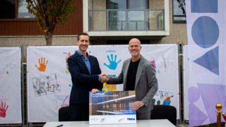DORDRECHT – Het woongebouw aan de Vorrinklaan in de Dordtse wijk Crabbehof onderging een flinke duurzame metamorfose. De 70 appartementen van woningcorporatie Trivire werden voorbereid op een energiezuinige toekomst. Voor de renovatie werkte Trivire samen met VORM Renovatie. Op vrijdag 17 oktober werd deze samenwerking officieel bekrachtigd. Marcel Korthorst, bestuurder van Trivire, en Timo Stoopman, directeur bestaand vastgoed van VORM, zetten hun handtekening tijdens een feestelijk moment op het schoolplein van de nabijgelegen John F. Kennedyschool. ( Foto: Kelly Megens )