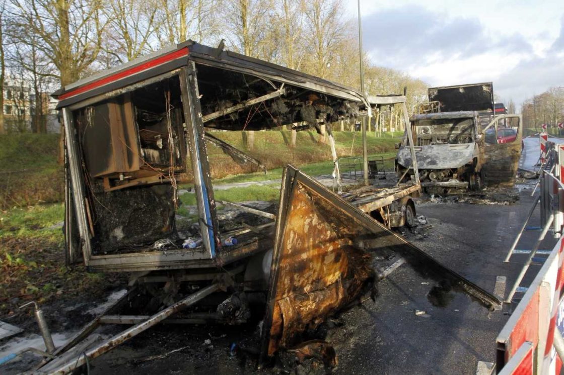 DORDRECHT – De brandweer rukte op Tweede Kerstdag ’s morgens vroeg uit voor een brand aan de Schenkeldijk. Daar stonden een busje en oplegger in brand. De brandweer bluste met schuim, maar de brand was dermate fel dat niet kon worden voorkomen dat beide voertuigen volledig uitbrandden. Er wordt onderzocht of er sprake is van brandstichting. (Foto en video: Thymen Stolk)