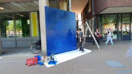 DORDRECHT – Iconoclash en DOOR bieden de komende maanden artiesten uit Dordrecht de kans om tijdelijk hun werk te exposeren in de openbare ruimte. Op de pilaren voor het oude belastingkantoor aan de Spuiboulevard, waar DOOR overigens eind dit jaar uit moet, worden tijdelijk acht canvassen geplaatst. In totaal zestien kunstenaars gaan, verdeeld over vier edities, in dit openluchtatelier aan de slag met een bepaald thema. Tijdens de eerste editie, die zaterdag werd gehouden, was het thema ‘honden’. Passerend publiek kon de vorderingen volgen. De volgende edities zijn op 10 juli, 11 september en 6 november. (Foto’s en video: Thymen Stolk)