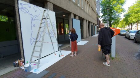 DORDRECHT – Iconoclash en DOOR bieden de komende maanden artiesten uit Dordrecht de kans om tijdelijk hun werk te exposeren in de openbare ruimte. Op de pilaren voor het oude belastingkantoor aan de Spuiboulevard, waar DOOR overigens eind dit jaar uit moet, worden tijdelijk acht canvassen geplaatst. In totaal zestien kunstenaars gaan, verdeeld over vier edities, in dit openluchtatelier aan de slag met een bepaald thema. Tijdens de eerste editie, die zaterdag werd gehouden, was het thema ‘honden’. Passerend publiek kon de vorderingen volgen. De volgende edities zijn op 10 juli, 11 september en 6 november. (Foto’s en video: Thymen Stolk)