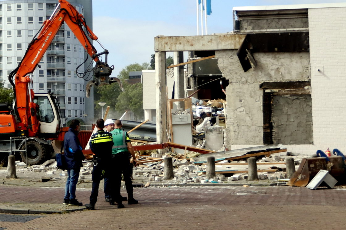 ZWIJNDRECHT – De knal was gisteravond tot in de wijde omgeving te horen. De ravage is enorm. De plofkraak bij de pinautomaat van ABN AMRO bij winkelcentrum Walburg heeft een grote impact gehad. Een sloopbedrijf is vandaag begonnen met opruimen van de ravage. De politie doet ondertussen onderzoek. Getuigen hebben twee jongemannen zien wegrijden. Het is nog niet bekend of ze geld hebben buitgemaakt. (Foto’s en video: Thymen Stolk)