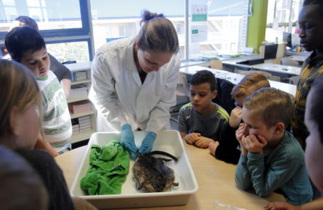 DORDRECHT – Een bijzondere biologieles voor de groep 5/6 leerlingen van basisschool de Fontein (locatie Wielwijk). Zij kregen woensdag les van Biokaatje, oftewel Karin Lammers die een bijzonder creatieve methode heeft om kinderen te interesseren voor de natuur. Zo verzorgt de biologe onder meer workshops waarbij kinderen een heus dierenskelet in elkaar mogen puzzelen. Nu heeft zij een nieuw programma ontwikkeld waarbij een lang gekoesterde wens in vervulling gaat. Zo maakten de scholieren woensdag kennis met een ontlede muskusrat. “Een ontleed dier is voor kinderen een mind-opener. Zo ziet het er dus uit in het echt. Het maakt de stof, de theorie heel tastbaar. Als je het bijvoorbeeld hebt over spijsvertering en je kijkt naar het dier, zien ze dat het heel logisch is dat bepaalde dingen nu eenmaal zo werken.” De aanpak van Biokaatje heeft een aanstekende werking. “Kinderen zien dat wetenschap helemaal niet stoffig is, maar juist leuk en spannend.” De zes, geprepareerde muskusratten die ze in haar bezit heeft voor het ‘snijpracticum’, zijn niet voor haar lessen gedood. De muskusratten zijn gedood omdat ze dijken kapot maken. “Ik zou niet willen dat er voor mij een dier wordt gedood.” Een alternatief is er ook nog: een inktvis. “Die worden als bijvangst op de markt verkocht”, weet ze.( Foto en Video : Thymen Stolk )