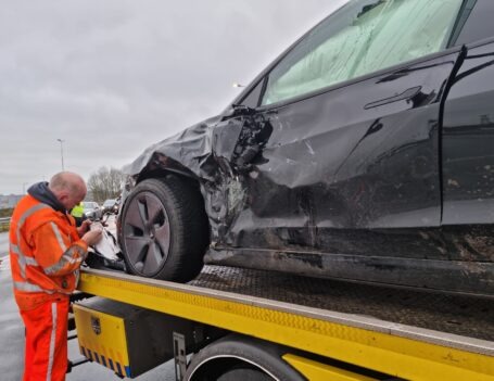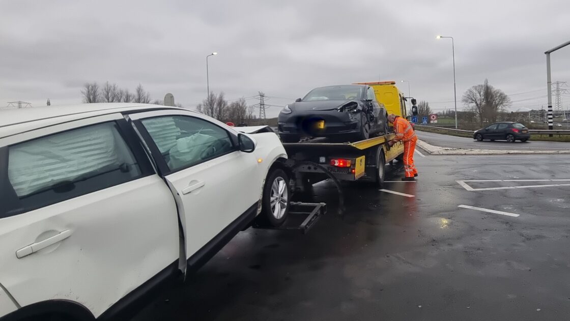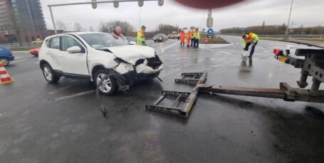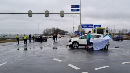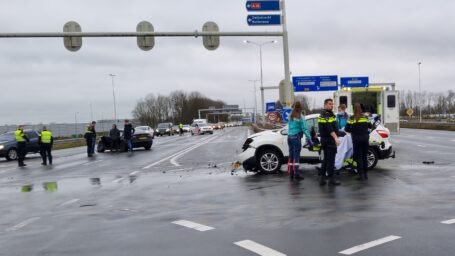 DORDRECHT – Bij een aanrijding op het kruispunt van de aansluiting van de N3 op de A16 richting Rotterdam liepen vanmiddag twee personenauto’s forse schade op. De inzittenden van de auto die aan de zijkant werd geraakt, kwamen met de schrik vrij. Een inzittende van de andere wagen werd met rug- en nekklachten naar het ziekenhuis gebracht. (Foto’s en video: Stolk Fotografie)