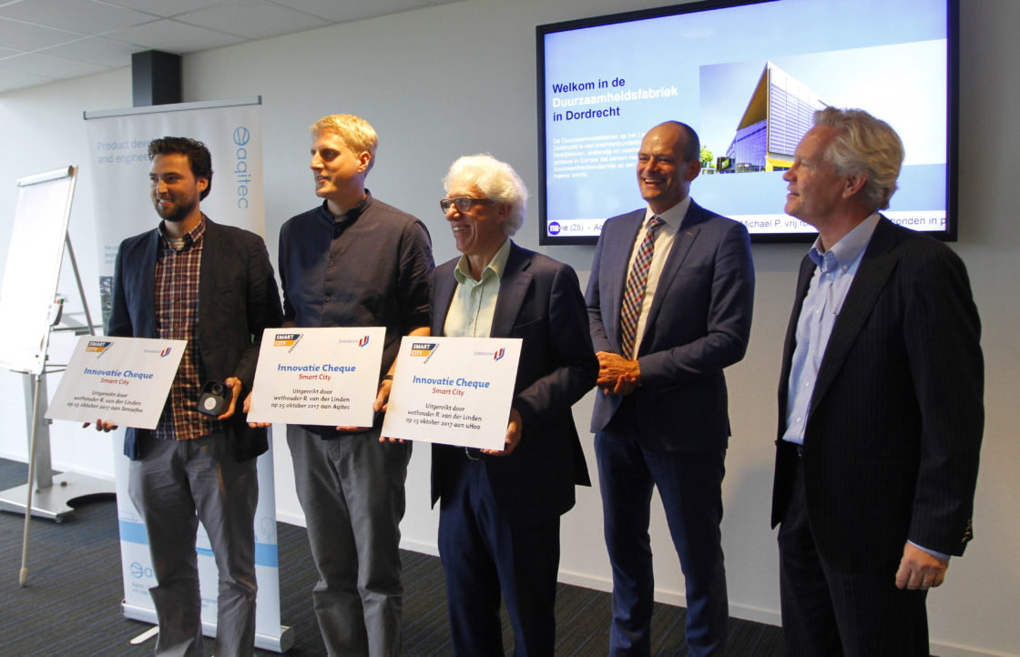 DORDRECHT – Wethouder Rik van der Linden (Duurzaamheid) heeft de eerste drie Innovatie Cheques uitgereikt voor innovaties die van Dordrecht een slimme duurzame stad moeten maken. Het bedrijf SenseFox kreeg de prijs, omdat zij een sensor maken die meet hoe vol een vuilcontainer is. Op dit moment is er een pilot met een container dichtbij een hangplek van jongeren in de stad. De sensor blijkt goed te werken en de vuilophaalwagen komt alleen voorrijden als de container vol zit. (Foto en video: Thymen Stolk)