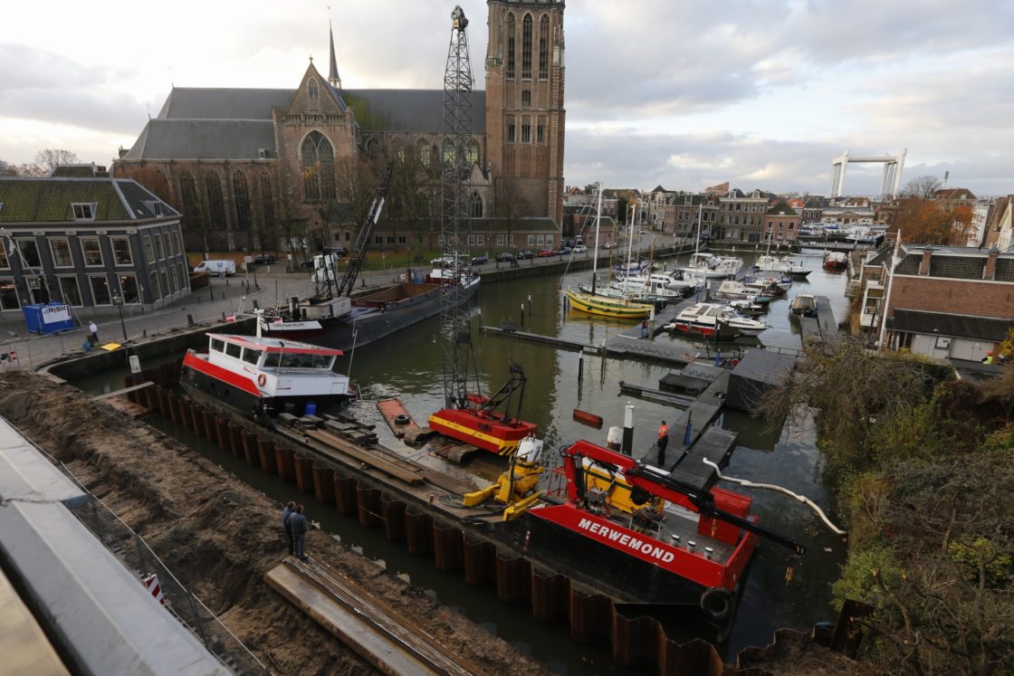 DORDRECHT – Een lekkend ponton heeft er maandagavond voor gezorgd dat een hijskraan en een werkschip zijn gaan hellen in het Maartensgat. De gemeente is dinsdagmorgen begonnen met de bergingswerkzaamheden.