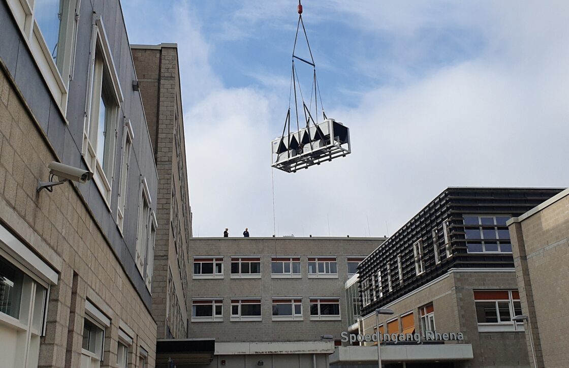 DORDRECHT – Afgelopen voorjaar ging een deel van de koelinstallatie van het Albert Schweitzer ziekenhuis kapot. Om dit probleem op te vangen werden aan de achterzijde van het pand drie noodmachines neergezet. Niet fijn voor de bewoners van de Oudendijk die in de zomer ondanks geluidwerende maatregelen het gezoem van de noodmachines moesten horen. Het kon niet anders, de koeling is essentieel voor het functioneren van de laboratoria en operatiekamers. Niet alleen de bewoners, maar ook het ziekenhuis zelf, zijn blij dat er nu wordt gewerkt aan een structurele oplossing. Met een enorme kraan werd afgelopen weekend de eerste van twee nieuwe koelmachines op het dak van het ziekenhuis gehesen. Op 23 oktober volgt de tweede en volgend jaar nog eens vier. (Foto’s en video: Thymen Stolk)