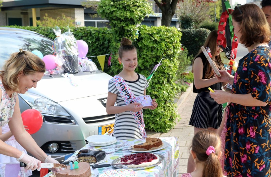 DORDRECHT – Sanne van den Berg uit Stadspolders werd zondag 12 jaar. Haar verjaardagsfeestje dreigde door bekende omstandigheden in het water te vallen. Daar staken haar ouders en zussen echter een verrassend stokje voor. “Ze heeft net te horen gekregen dat het groep 8-kamp niet doorgaat en ze zat er aardig mee dat ook haar verjaardag niet gevierd kon worden”, zegt moeder Karen. Samen met echtgenoot Arie en de andere dochters Gwen (13) en Jill (6) bedacht ze een origineel plannetje: een ‘verjaardags-drive-through’. Tussen elf en twaalf uur konden familie en vrienden met de auto langsrijden om een stukje taart ‘in te laden’ en een kaartje en/of cadeautje af te geven.