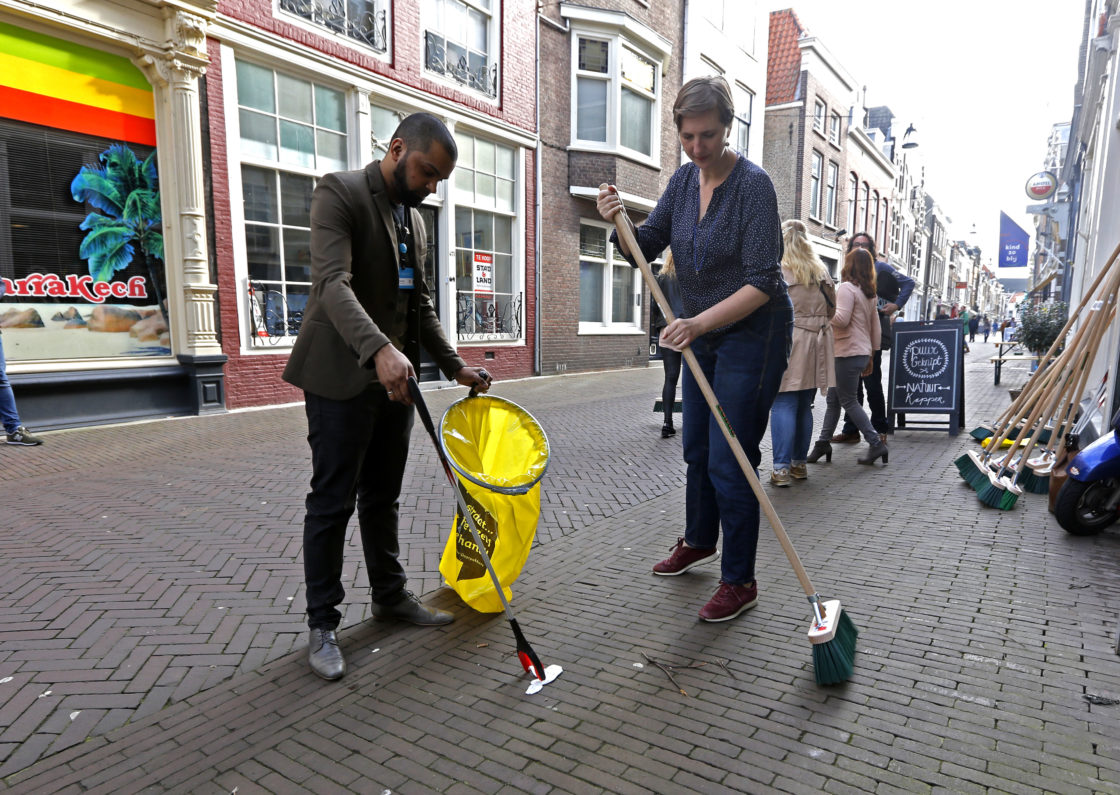 DORDRECHT – In het kader van Dordt Schoon werden er afgelopen week diverse schoonmaakacties gehouden in Dordrecht. Donderdagochtend staken dertig winkeliers van de Voorstraat-West de handen uit de mouwen om ‘hun’ straat een stukje schoner te maken. Ook wethouder Reynvaan kwam langs om bezems uit te delen en ook zelf even mee te vegen. ( Foto en Video: Thymen Stolk)