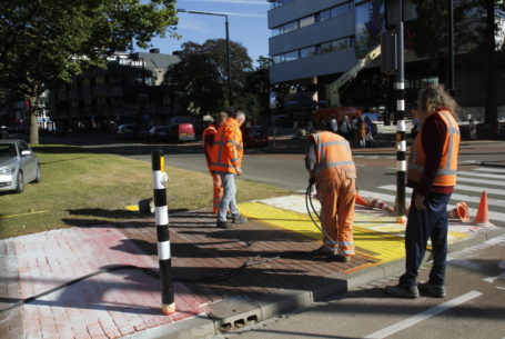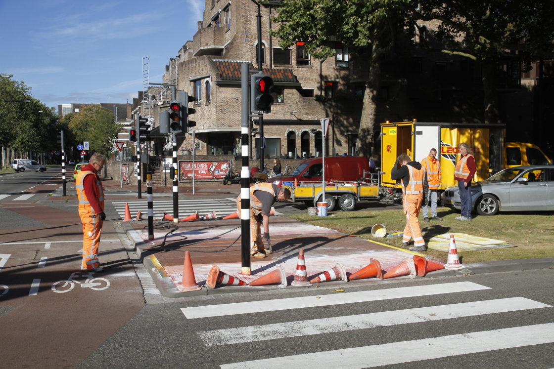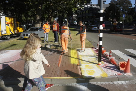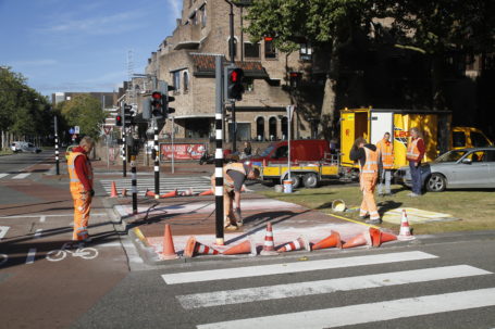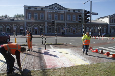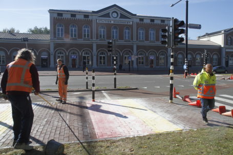 DORDRECHT – Vlak voor het station is donderdagmorgen begonnen met de aanleg van een regenboogzebrapad. Het pad komt er op voorspraak van GroenLinks. De gemeenteraad nam dit voorstel over en wil zo laten zien dat iedereen in Dordrecht welkom is. Het pad wordt aangelegd op ‘coming out day’. Hiermee wordt wereldwijd aandacht besteed aan het moment waarop homo’s, lesbiennes, biseksuelen of transgenders openlijk voor hun seksuele geaardheid uitkomen. Het pad ‘vervangt’ geen bestaand zebrapad, maar is aangelegd op de stoep bij de oversteekplaats tussen de beide rijrichtingen van de Stationsweg. (Foto’s en Video : Thymen Stolk)