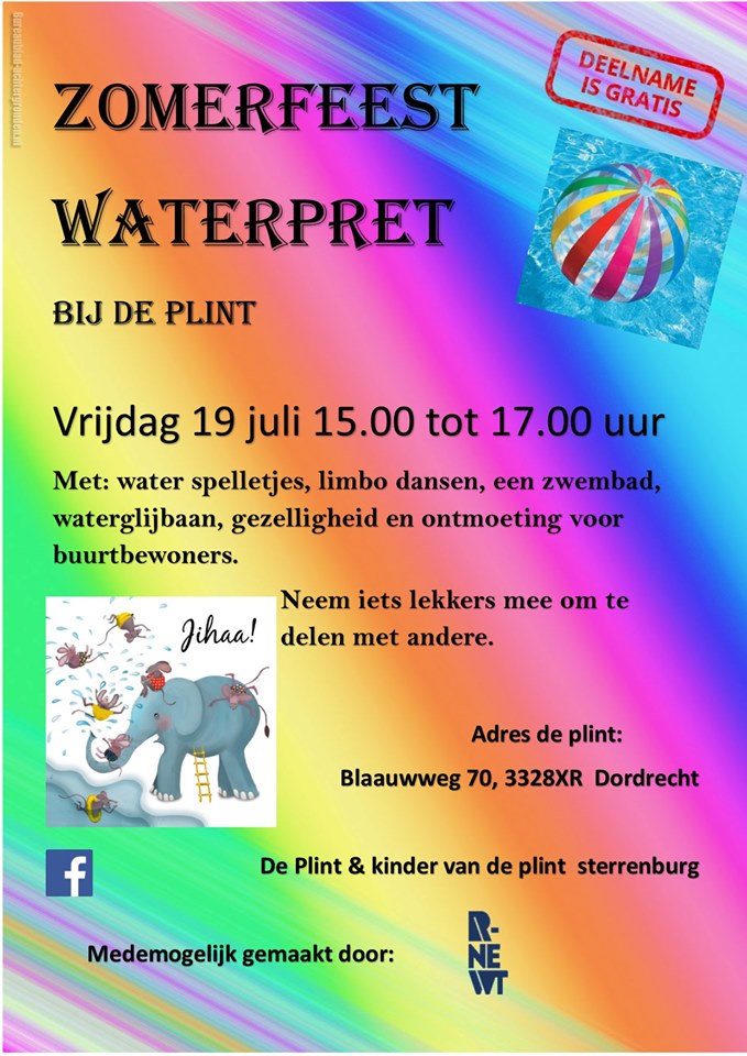 DORDRECHT – Om de zomervakantie op een feestelijke manier te starten organiseert de kinderactiviteit van De Plint met jongerenwerk R-Newt en Dordt Sport een zomerfeest met het thema ‘waterpret’. Op vrijdag 19 juli van 15.00 tot 17.00 uur kunnen de kinderen uit de buurt deelnemen aan allerlei sport- en spelactiviteiten. De organisatie vindt het leuk als buurtbewoners komen om elkaar te ontmoeten en eventueel iets lekkers meenemen om te delen met anderen. Het zomerfeest wordt gehouden achter de Plint (Blaauwweg 70) op het grasveld van de Stratosfeerstraat. De spelletjes zijn gratis en kinderen kunnen meedoen vanaf ongeveer 7 tot 14 jaar. Opgeven is niet nodig. Jongeren (vanaf 15 jaar) en volwassenen kunnen helpen bij de spelletjes.