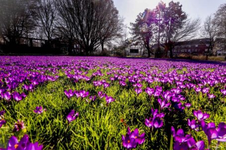 DORDRECHT – In Dordrecht bloeien de paarse krokussen op het grasveld aan het Van Baereplantsoen volop. Het mooie voorjaarsweer zal de komende dagen nog aanhouden met volop zon en hoge temperaturen. ( Foto: Stolk Fotografie )