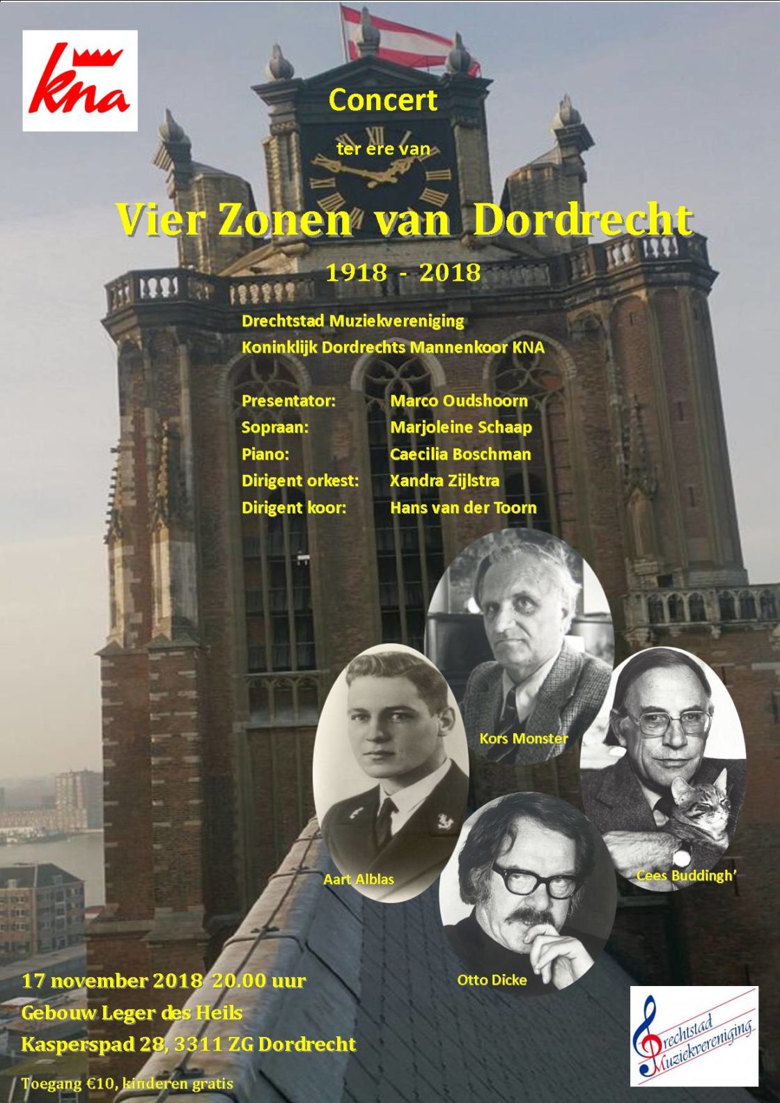 DORDRECHT – Drechtstad Muziekvereniging en het Koninklijk Dordrechts Mannenkoor KNA herdenken de ´Vier Zonen van Dordrecht´ in een bijzonder concert op zaterdag 17 november. Een muzikale hulde aan Kors Monster, een eerbetoon aan Aart Alblas, gedichten van Cees Buddingh’ en tekeningen van Otto Dicke; ze komen allemaal voorbij.