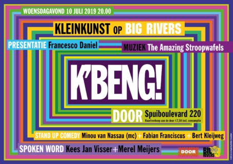 DORDRECHT – What happens when DOOR meets Big Rivers? K’BENG! Op woensdag 10 juli vanaf 20.00 uur vindt de tweede editie van deze kleinkunst- en stand-up comedyavond plaats. De acts die hun opwachting maken in DOOR aan de Spuiboulevard zijn The Amazing Stroopwafels, Playground Comedy, Merel Meijers en Kees-Jan Visser.