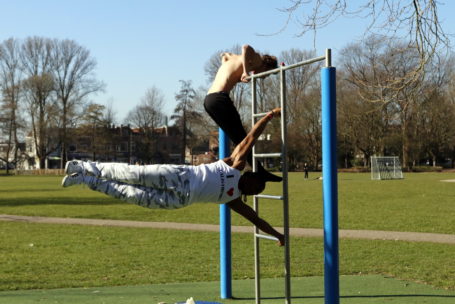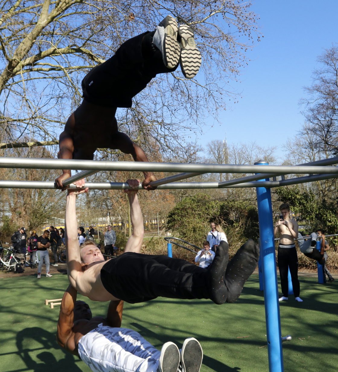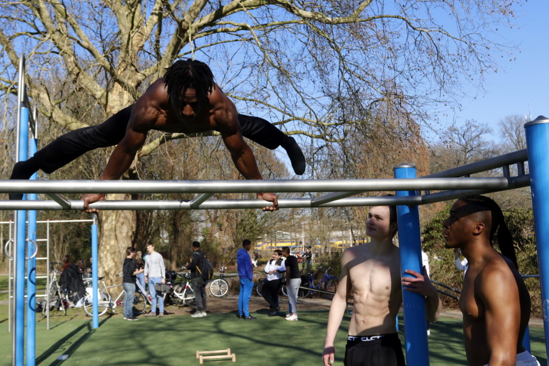 DORDRECHT – In het Weizigtpark werd woensdag een sportieve actie georganiseerd voor een goed doel: geld ophalen voor ‘changemakers’ over de hele wereld die zich inzetten voor veilige scholen. Calisthenics 4 KidsRights werd georganiseerd door Jason Bonam en online RTL-jongerenplatform Concentrate. Jason en enkele andere sportievelingen vertoonden hun kunsten op de calisthenics-toestellen in het park en gaven workshops. Daarvan werden opnames gemaakt voor RTL-Concentrate. (Foto’s: Thymen Stolk)