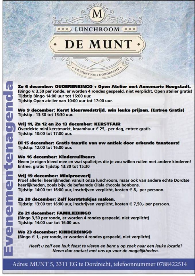 DORDRECHT – In Lunchroom De Munt wordt in de decembermaand een heleboel leuks georganiseerd. De lunchroom is te vinden aan De Munt 5.