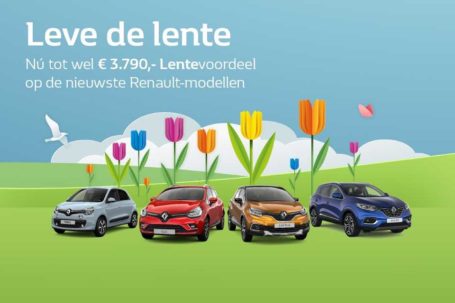 Leve de lente! De showrooms van Auto Indumij staan bol van het lentevoordeel. Kies je voor onze superscherpe CLIO Private Lease topdeal of een gloednieuwe Twingo of Captur? Kijk ook eens naar de Mégane Estate Bose, tijdelijk leverbaar met 3.790 euro lentevoordeel bij Auto Indumij. Voor welke Renault je ook kiest, de hoge inruilwaarde van jouw huidige auto staat als een tulp boven het maaiveld!